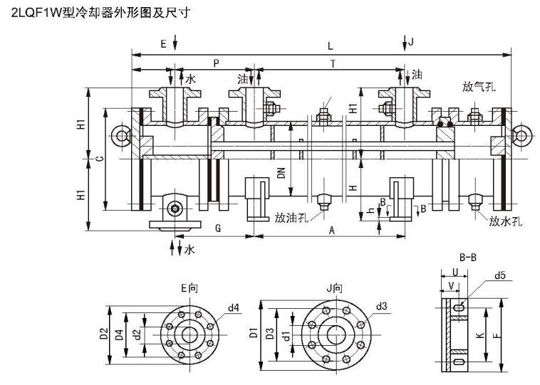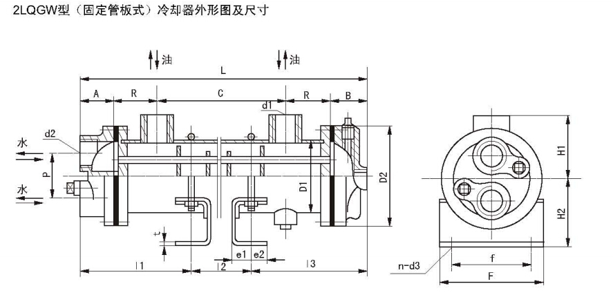 與GLLQ型列管式冷卻器相似,產品適用于冶金、礦山、輕工、電力、化工等行業的液壓與潤滑裝置,將熱工作油冷卻到要求的溫度;冷卻器的設計最高溫度為10CTC~12(TC,工作壓力≤1.6MPa,傳熱系數為348~407w/m2.k,(若采用翅片管換熱,則傳熱系數為523~580W/m2.k,但允許介質粘度范圍為10~50cSt)。下面列出的2LQF型冷卻器則規定介質粘度為10~326cSt,主要技術參數如下表。