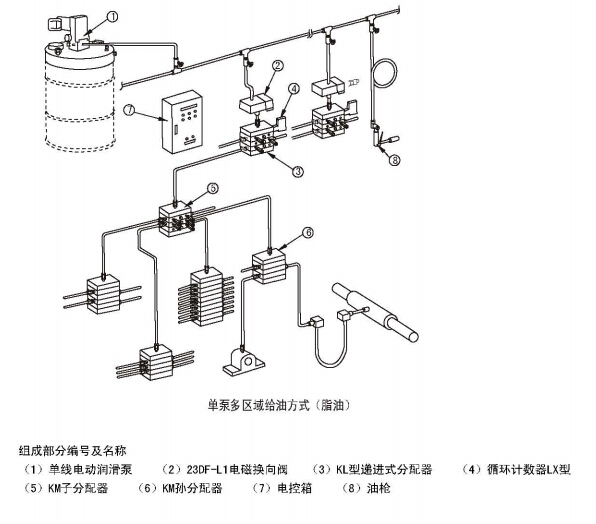 單線集中潤滑系統是由泵站輸出高壓潤滑脂經輸脂主管供送給母遞進式分配器(每次供脂量較大)從母遞進式分配出來時油經輸脂支管,供送到二次分配器(子分配器)(每次定量壓出的潤滑脂較少)再定量逐級供送給各潤滑點。其中電控箱起到指令自動供送潤滑脂的功能。