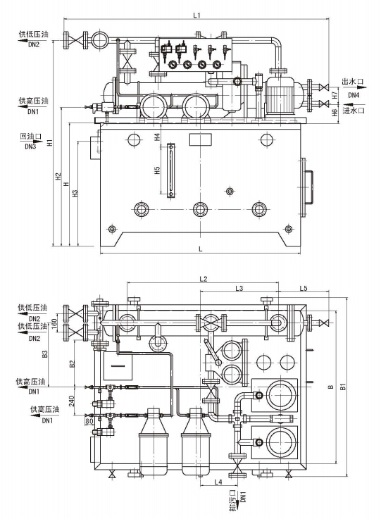 (1)若將低壓泵油量分成兩路供油管道時,可以用一套雙高低壓稀油站代替二臺普通高低壓稀油站(如 GXYZ型A系列高低壓稀油站中較小者);參閱下面外形結構及尺寸圖。