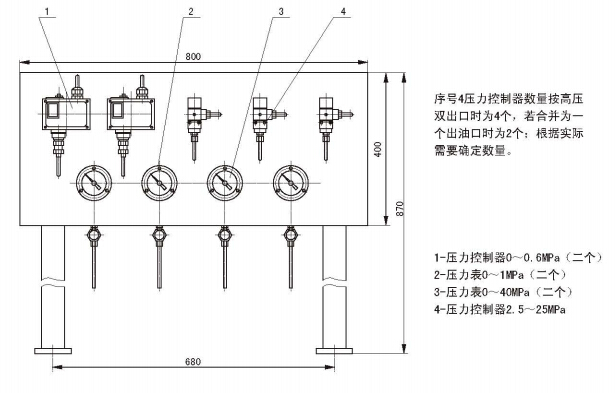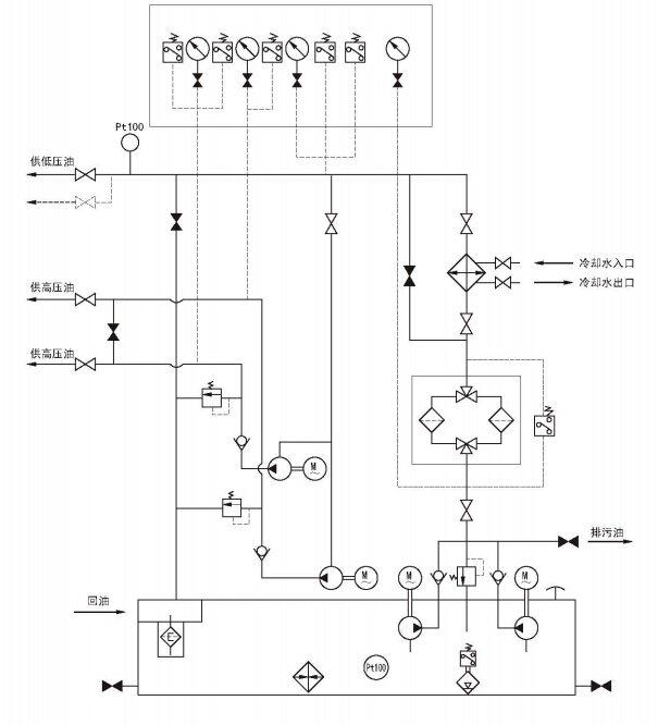 雙高低壓稀油站的主要特點為一套稀油站有兩路高壓輸出管道,可滿足兩個高壓潤滑點的需要,其他和普通高低壓稀油站相同。