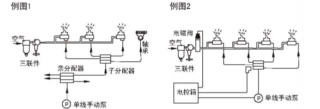 2、系統中葉可使用壓力控制閥和JPQ-L型分配器,可參閱電動潤滑泵終端式二級分配系